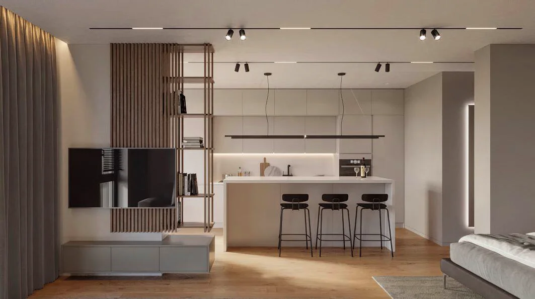 В интерьере доминируют нейтральные тона, такие как белый, бежевый и серый, что создает спокойную и гармоничную атмосферу.
